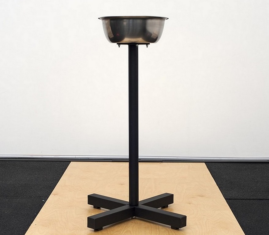 Пыль от магнезии будет максимально локализована в одном месте. Чашу на стойке можно переносить в любое место зала Чаша изготавливается из нержавеющей стали с зеркальной полировкой. Высота стойки будет удобна атлетам с различным ростом. Крестообразное основание устойчиво стоит на полу. Поверхность стойки окрашена черной матовой порошковой краской.