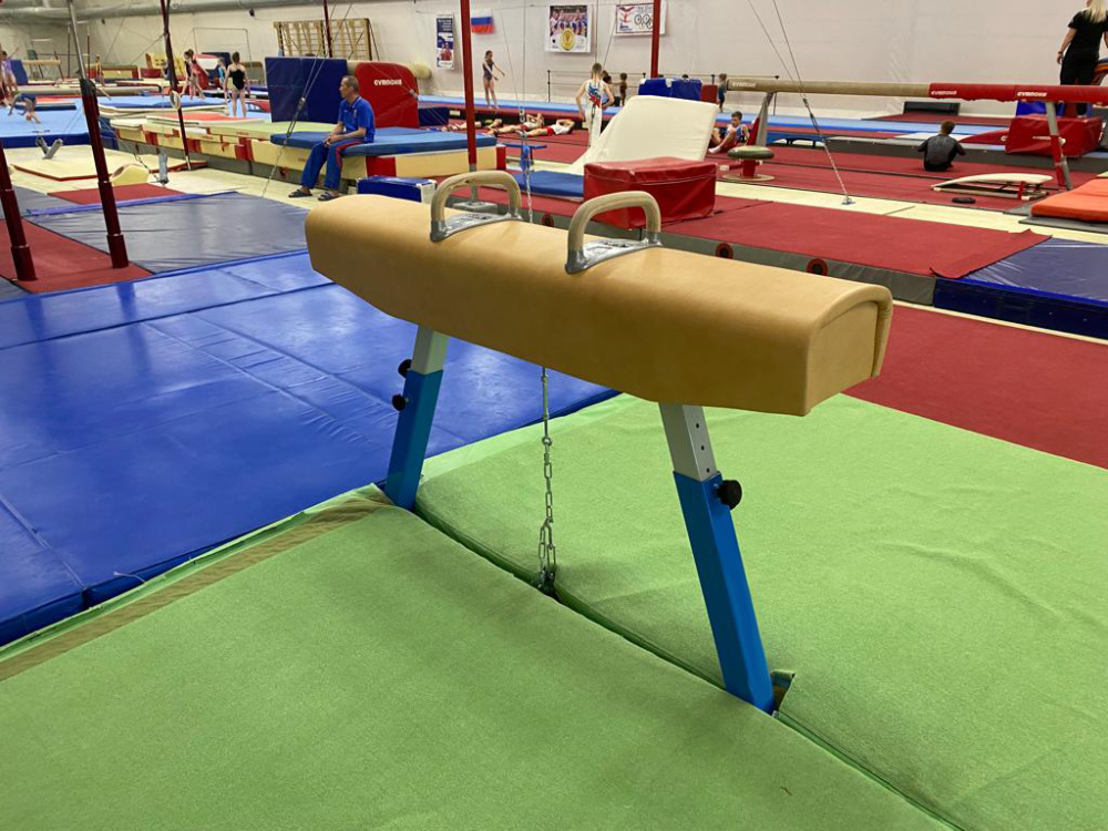 Конь установлен на регулируемых металлических опорах Т-образной формы. опоры снабжены резиновыми протекторами.