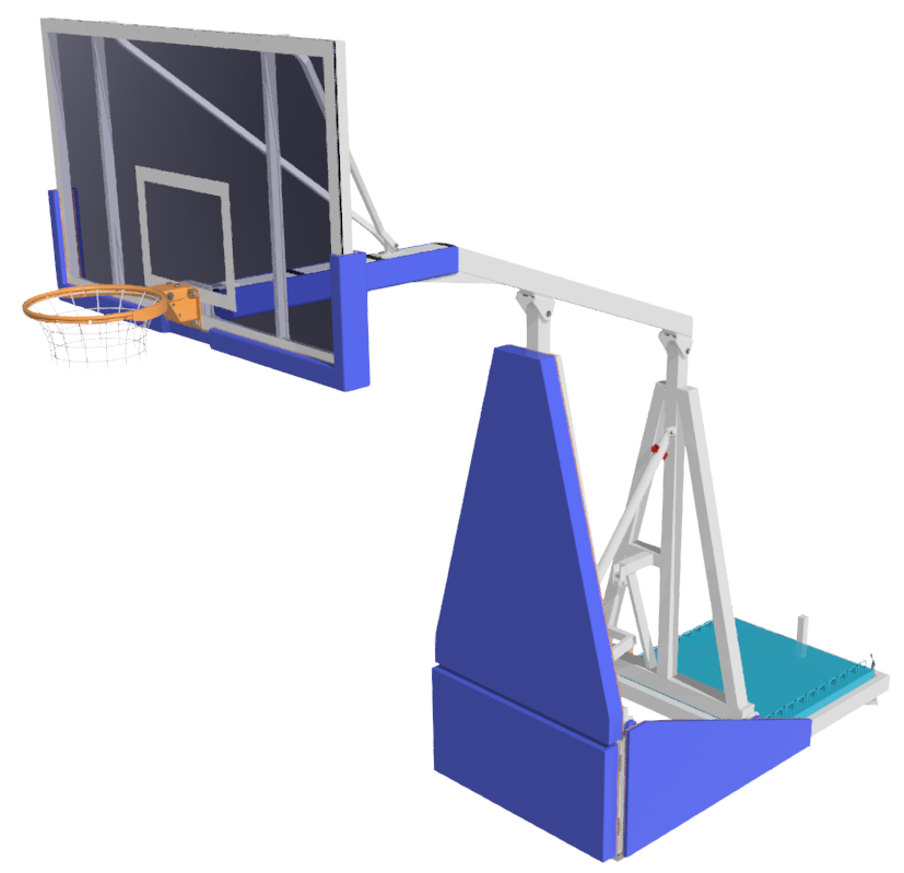 Щит баскетбольный игровой 1800х1050мм из поликарбоната 10мм; кольцо амортизационное с трубчатой системой крепления сетки; сетка баскетбольная; протектор щита, выноса, стойки. Мобильная складная стойка снабжена поворотными и не поворотными колесами, и в сложенном состоянии перекатывается одним человеком. В конструкции стойки в подвижных соединениях используются подшипниковые соединения. Подъем стрелы осуществляется с помощью электрической лебедки с пультом. Габаритные размеры: в свернутом положении без щита – длина 3,04м, ширина по раме стойки с защитой 1,28м, высота 2,05м; в развернутом положении — длина (со щитом, кольцом и защитой ) 4,69м, ширина по раме стойки с защитой -1,28м, максимальная высота от поверхности площадки до верхнего края щита–3,95м. Вес стойки без противовесов-325кг