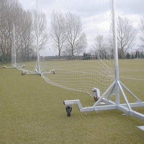 Стойка выполнена с использованием высокопрочной стали. Окрашена полимерной износостойкой порошковой краской. Конструкция снабжена колесами с фиксатором для перемещения стойки по полю.