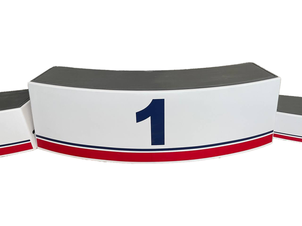 Элемент 3 Длина (мм) Ширина (мм) Высота (мм) 1870х 753х 250. Пьедестал почета изготовлен из стекловолокна, 3 отдельные платформы цилиндрической формы, каждая предназначена для 4 человек. Сверху резиновая антискользящая поверхность. Складываются один в другой.