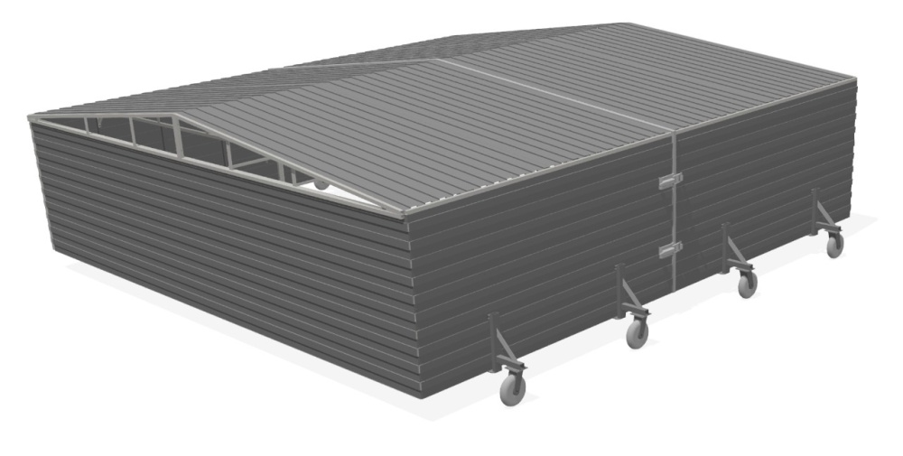 Состоит из 2-х частей. Обшивка - профильный лист. Покраска в порошок с внешней стороны. Крепление профильного листа к металлоконструкции с помощью кровельных саморезов. Колеса – 8 шт., диаметр 210 мм.