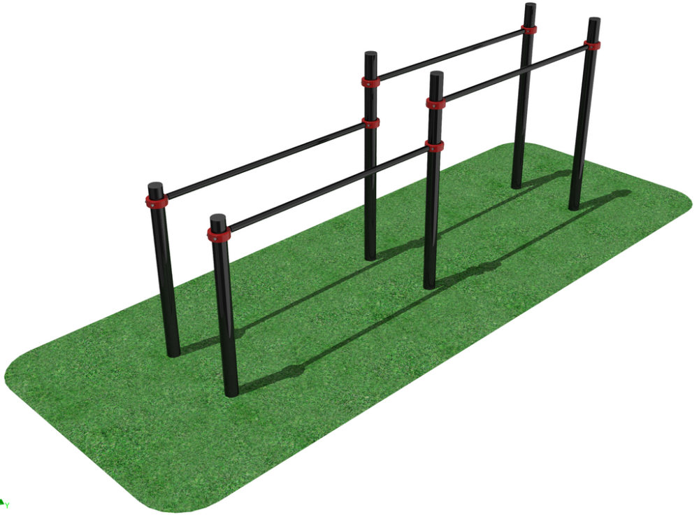 Спортивный комплекс состоит из шести вертикальных опорных стоек и четырех перекладин. Диаметр опорных стоек 89мм. Высота опорных стоек: 1600 мм - 4 шт., 1200 мм - 2 шт. Диаметр перекладин - 42 мм. Длина перекладины 1710мм. Перекладины и опорные столбы скреплены между собой при помощи хомутов